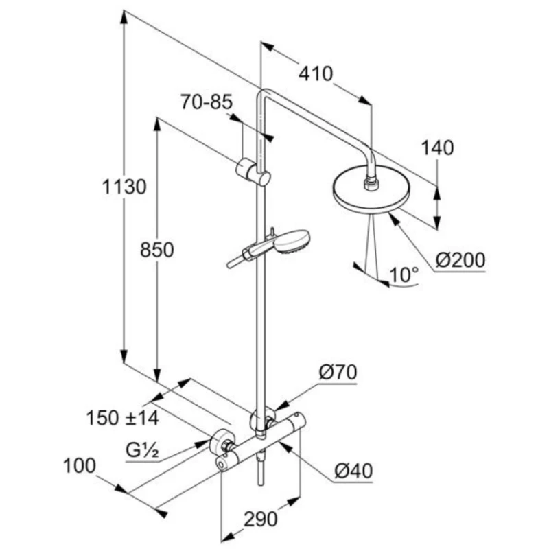Штанга душевой стойки имеет размер от 960 до 1260 мм, что позволяет настроить высоту верхнего душа в соответствии с вашими предпочтениями. В комплекте также имеется ручной душ с трёмя режимами использования (Body/Hair/Skin), который обеспечивает разнообразные возможности при приеме душа.