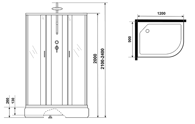 - Габариты с верхним душем (высота душа устанавливается единоразово при установке) (ШхВхД): 120х210-240х90 см.