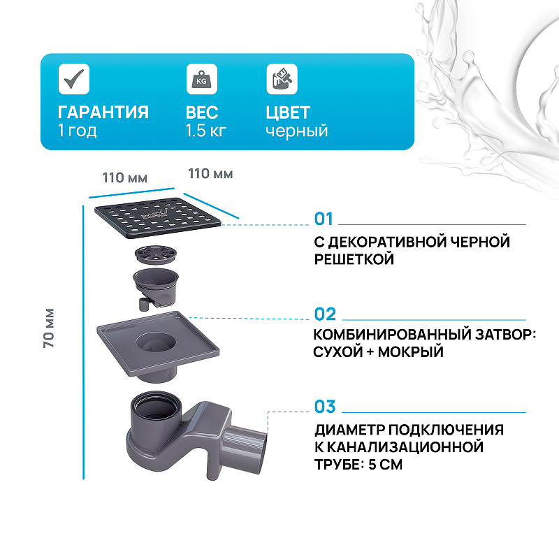- Вид затвора: комбинированный (сухой / гидрозатвор).