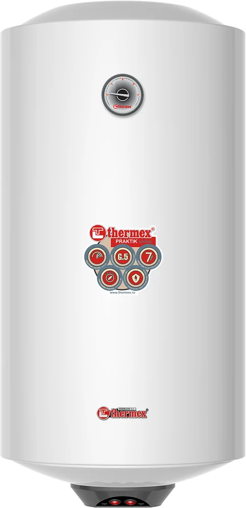 Название этой модели электрического водонагревателя российского производства Thermex Praktik 100 V говорит само за себя. Это практичное, надежное и долговечное устройство, главная задача которого – обеспечение горячей водой нескольких точек отбора. Его металлический кожух отличается повышенной прочностью и стойкостью к механическому воздействию и низким температурам, сохраняет свой привлекательный вид в течение всего срока службы. Внутренний бак изготовлен из нержавеющей стали, его поверхность остается в идеальном состоянии.Сварные швы обработаны по специальной технологии, не допускающей их коррозии и растрескивания. Его объема 100 литров хватит на удовлетворение потребностей 3–4 человек. Быстрый нагрев воды обеспечивает погружной ТЭН повышенной мощности – 2,5 кВт. Магниевый анод предотвращает образования накипи. Механическое управление позволяет легко переключаться между режимами: экономичным, стандартным и ускоренным. Для точного поддержания установленной температуры применен капиллярный термостат. Для контроля за ней используется термометр. Индикатор предупредит о нагревании воды.Функция защиты от перегрева прекратит подачу воды, если ее температура превышает 75 °C. Оборудование функционирует от сети 220 В, для подключения к которой оно снабжено электрическим кабелем с УЗО, защищающим от поражения током и короткого замыкания.