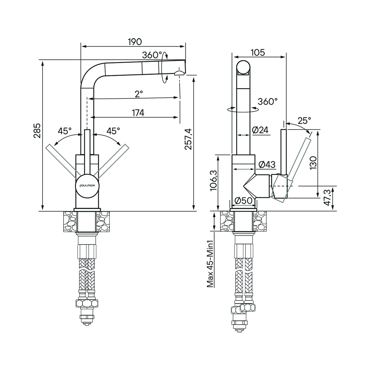 Высокий излив, способный поворачиваться на 180°, обеспечивает легкое мытьё и наполнение таких сосудов, как вазы или графины.