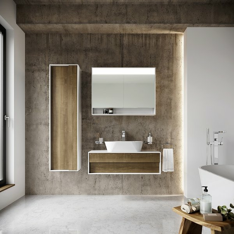 Тумба для умывальника SD Step 100 имеет усиленную столешницу с предварительно просверленным посередине отверстием для установки умывальника. Тумба оснащена одним полностью выдвижным ящиком с автоматическим закрыванием.