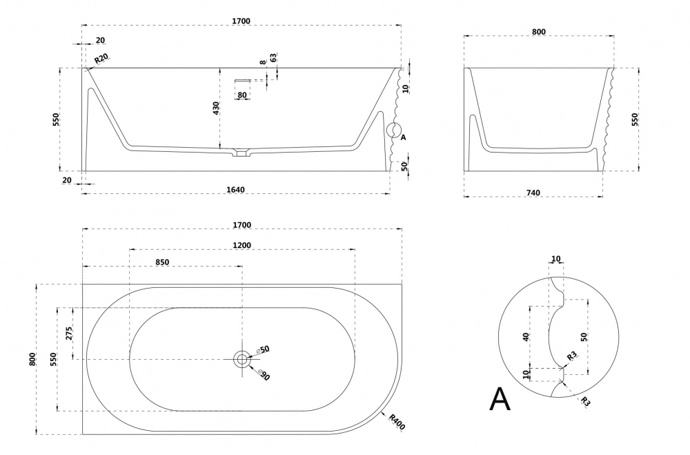 Ванна из искусственного камня Abber Stein 170x80 AS9651 L.